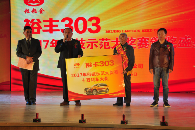 現(xiàn)場(chǎng)針對(duì)2017年221名裕豐303優(yōu)秀種植示范戶分別頒發(fā)十萬(wàn)轎車、金磚、電動(dòng)三輪車獎(jiǎng)品,以表彰他們科學(xué)種田、示范推廣優(yōu)良品種裕豐303所作出的突出貢獻(xiàn)。其中一等大獎(jiǎng)價(jià)值十萬(wàn)元的轎車被安徽蕭縣酒店鎮(zhèn)胡孝蘭摘得,其中參賽產(chǎn)量為2252.9斤;二等獎(jiǎng)價(jià)值5000元的金磚分別被河南省西華縣、滑縣、山東省梁山縣、陽(yáng)信縣、河北省臨漳縣、任丘市、安徽利辛縣、泗縣、江蘇灌云到等20個(gè)縣市示范戶獲得,其中山東省平度市張舍鎮(zhèn)石賢勝畝產(chǎn)達(dá)2108斤、滕州市張汪鎮(zhèn)張佑代畝產(chǎn)達(dá)2025.36斤、河北省灤平縣大屯鄉(xiāng)王國(guó)強(qiáng)畝產(chǎn)達(dá)2040.28斤;二等獎(jiǎng)20名平均畝產(chǎn)達(dá)1800以上。